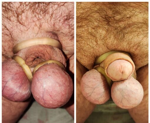 Wrapped my balls and whole package to try and get bigger (at least longer). It didn’t work. Still just a pathetic tiny nub. Big small balls and no cock. Even with a full erection it’s hard to say this is more than a clitty. In fact I have seen bigger clits on women.